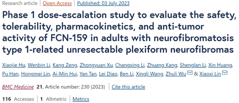 2. Hu X, et al. Phase 1 dose-escalation study to evaluate the safety, tolerability, pharmacokinetics, and anti-tumor activity of FCN-159 in adults with neurofibromatosis type 1-related unresectable plexiform neurofibromas. BMC Med. 2023 Jul 3;21(1):230. doi: 10.1186/s12916-023-02927-2.